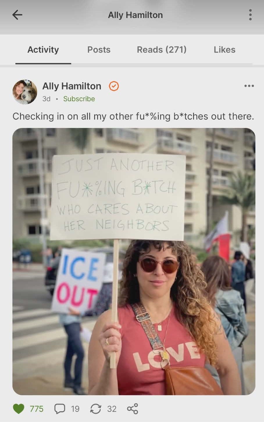 I will close this with the best sign I’ve seen since Renee Good was murdered. I intend to make one for myself. It so sums up our feelings about the thug who killed her and how we know there are too many men out there who’d like to be able to shoot any women who talks back to them. I have always hated people who say they’ve reclaimed a slur; I don’t like the word bitch. But I am reclaiming “fucking bitch,” as a response to that killer. Fuck him; I don’t want to carry the fear he wished on us.