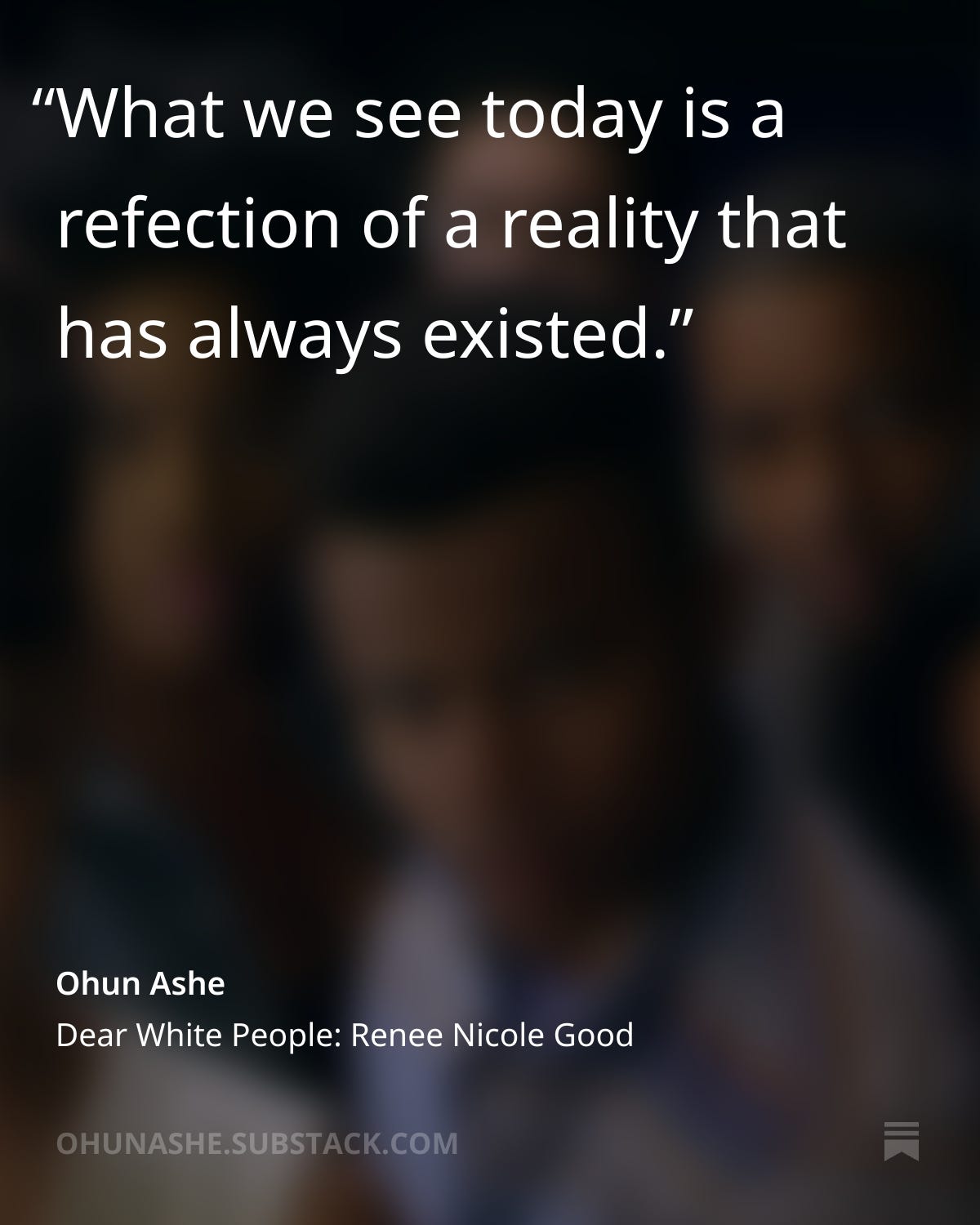 I urge you all to read this Dear White People essay by a fellow Substacker, Ohun Ashe, in which, after the outpouring of activism that followed Renee Good’s murder, she angrily observes that “White people are tasting what we have been choking on for decades — it’s a, for lack of a better term, a “mind-fuck” to watch an unjust murder happen so clearly on video, while others break it down to make the victim the villain. It’s manipulative isn’t it? It’s traumatizing, right? Now multiply this times1000 for the amount of Black names we’ve had to do this for.”